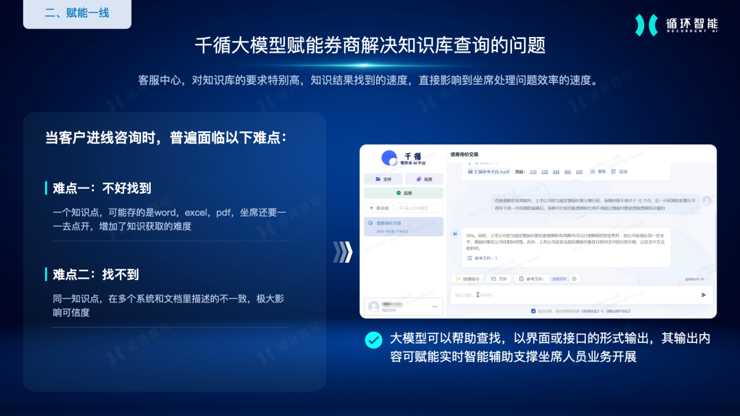 循环智能的千循大模型平台,可以支持企业接入各种类型的信息文档和知识库,只需要通过问答的形式,就可以实现企业知识的提取、总结和高效分析,让大模型基于接入的文档或知识库内容,从多个文档中查找相关信息,然后给出更加准确的答案。让企业知识管理、知识库查询更轻松。
