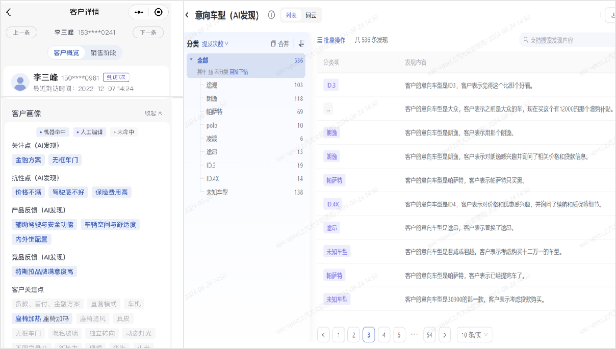 基于销售与客户沟通数据,大模型可动态识别客户所处销售阶段(如触达期、预选期、犹豫期、购买期),助力销售制定针对性的跟进策略,提升转化效率。